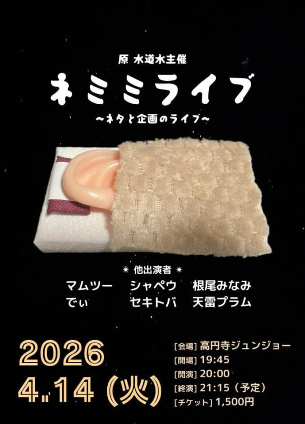 マセキの後輩・原水道水主催のネタと企画のライブ。フライヤーかわいい。入眠に良いネタというコンセプトなのでしょうか。